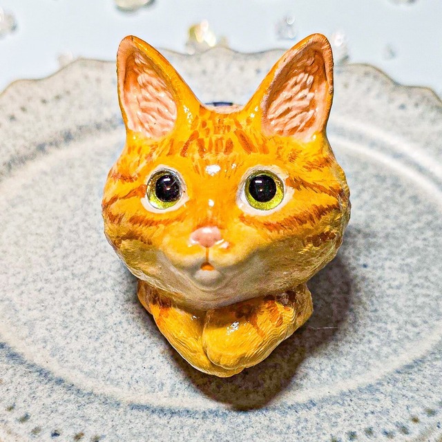 necone(ねこーね) 「ねこ」+「icone(フランス語でアイコン)」をかけた造語が由来の作品です 明るくて人懐っこくて、ちょっぴり甘えんぼ。 そんなイメージぴったりの茶トラ猫が、ちょこんと愛らしいブローチになりました。 3Dプリンターで成形したあと、しま模様や毛色の濃淡はすべて手作業で着彩。 短毛さんはつるんとすっきり、長毛さんはもふもふ感たっぷりの仕上がりです。 お洋服やバッグにそっと添えて、あなたの元にあたたかな陽だまりをひとつ。 素材:樹脂・軽量石膏粘土・ガラス サイズ:縦*横*厚み 約 5*4*3.5