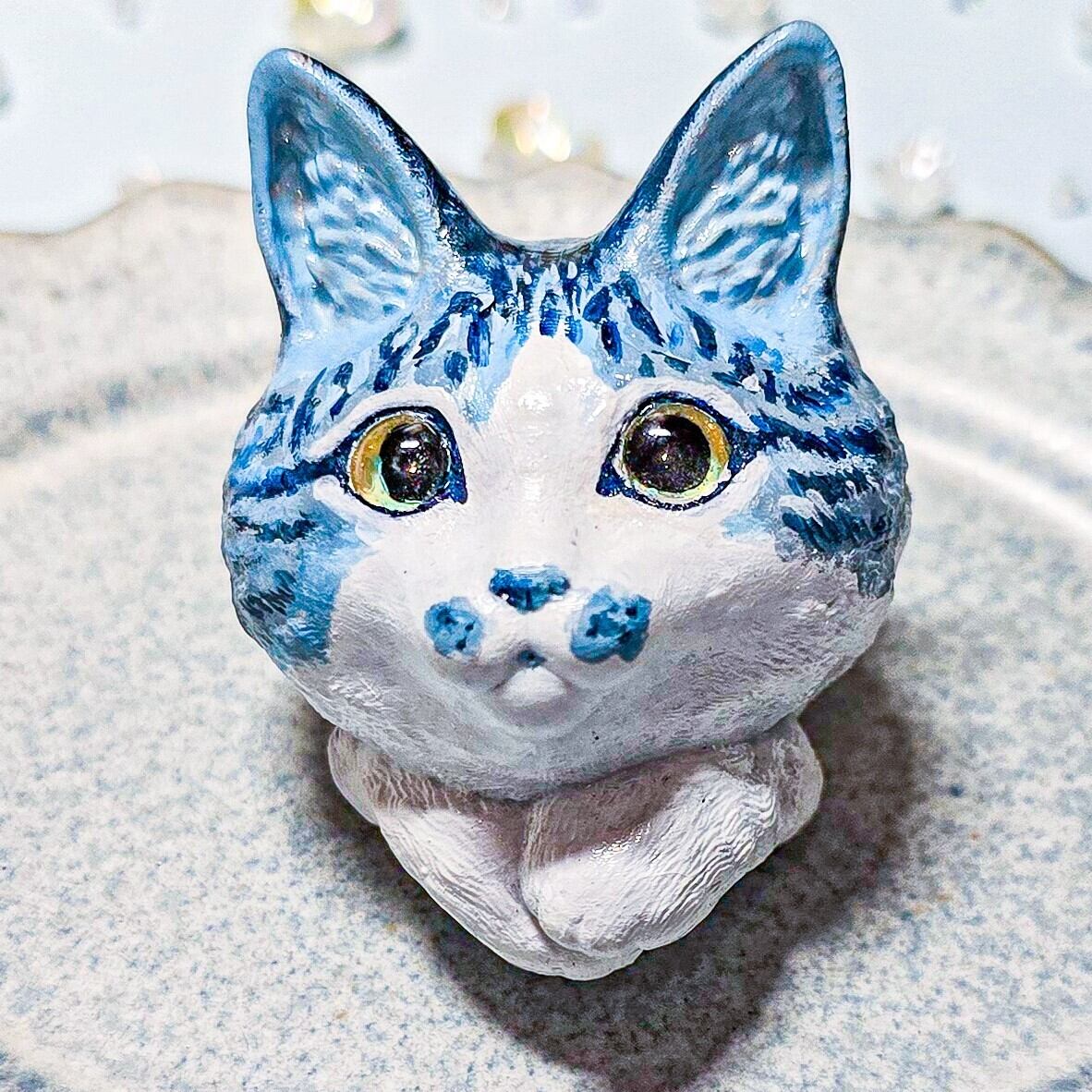 キジ白模様を青で描き出した、幻想的なブローチです。
